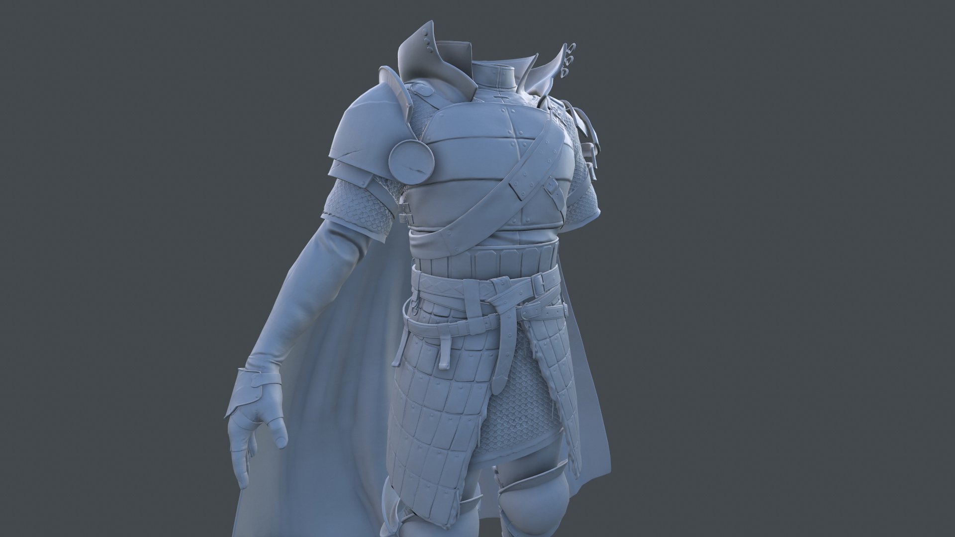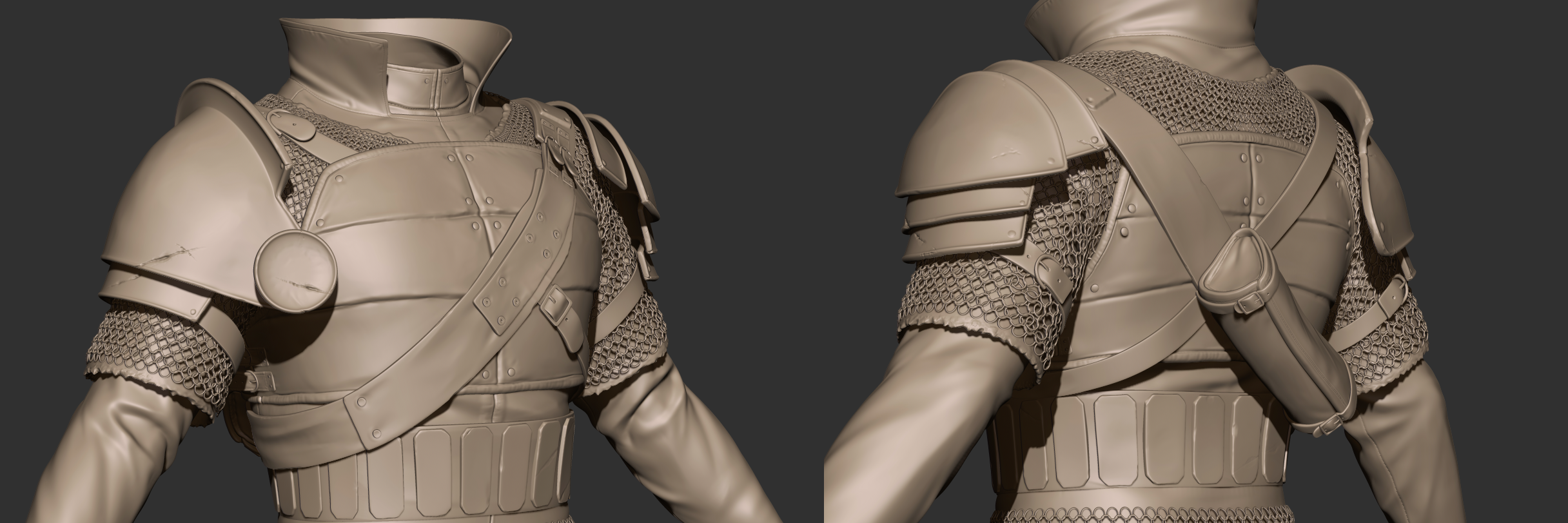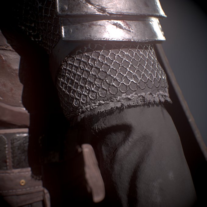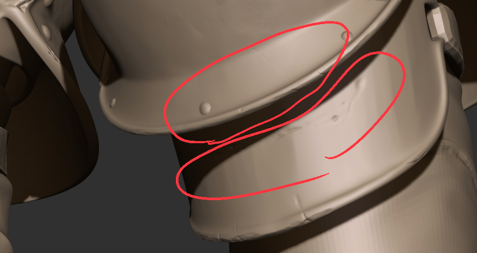 평범하게 작업중에 떠오른 부분이 있었습니다. 작은 흠집은 텍스쳐 작업때 넣는다고 해도 일부분은 스컬핑 단계에서 해 주는데, 추가하면 자연스럽고 좋을 것 같은 부분에 넣을 뿐 아니라 갑옷끼리 맞닿는 부분 등 현실적인 부분들도 고려해가며 묘사를 해 주려고 노력했습니다.