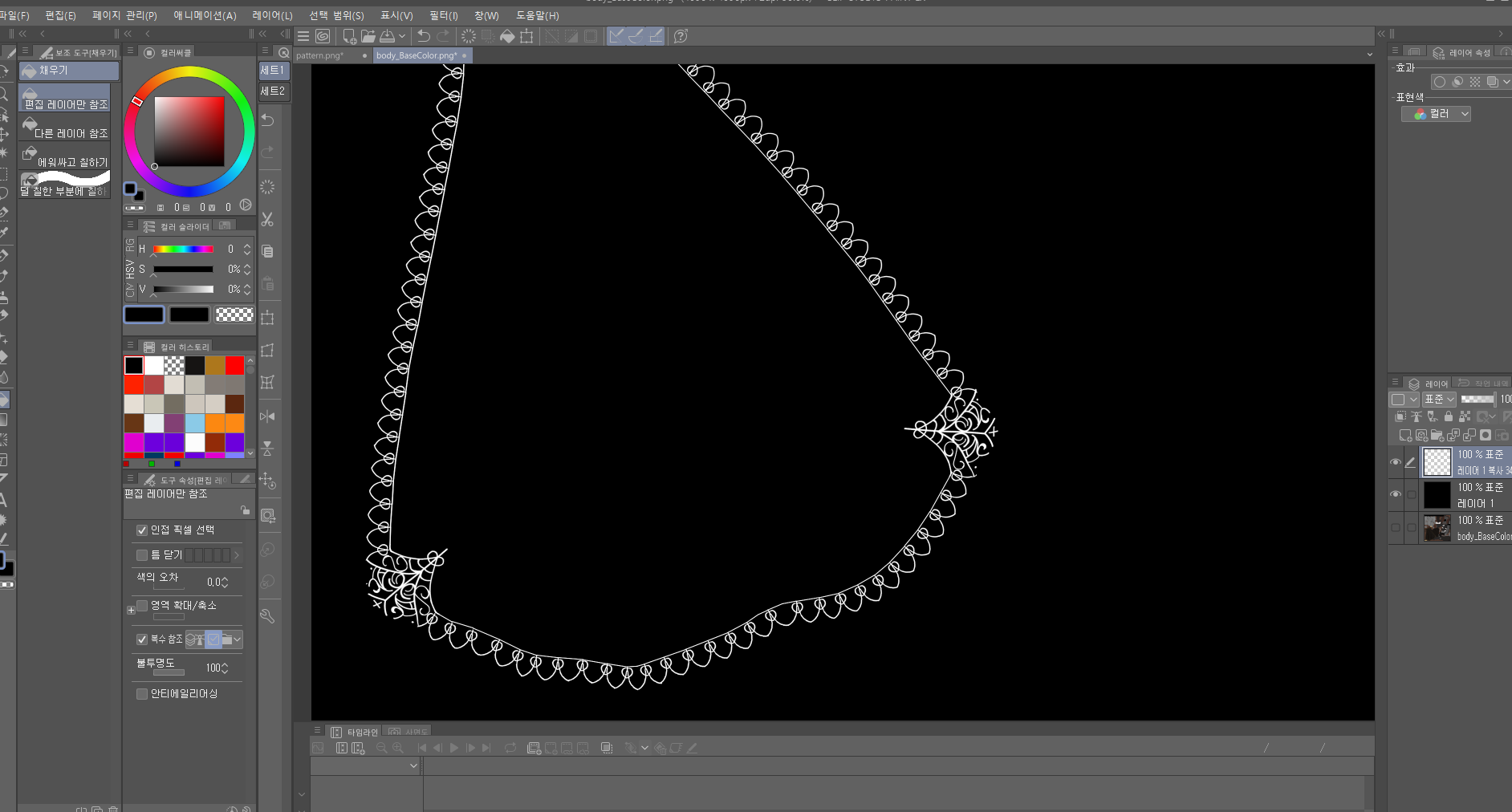 기본 재질을 배치해 준 뒤, 본격적인 텍스쳐링 작업에 들어갑니다. 가장 넓은 부분인 망토부터 시작했습니다. 문양 부분을 하나의 패턴을 만든 뒤 서브스탠스에서 찍어주려고 했는데 약간 불편함을 느껴서 마스크맵을 덧씌워줄 생각으로 클립스튜디오에서 제작했습니다.