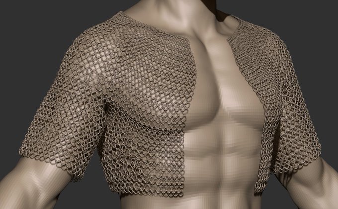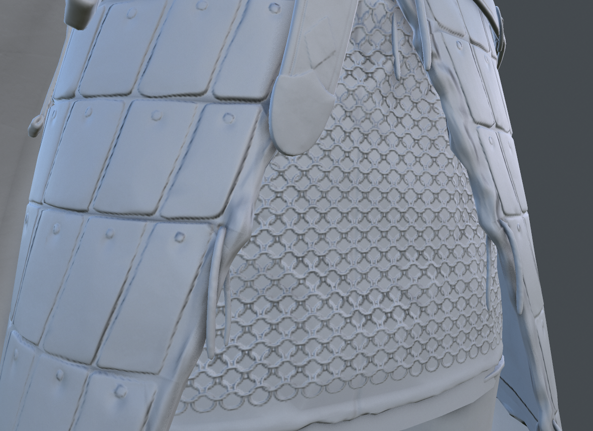스커트에 이 부분이 가죽을 격자 모양으로 재봉해서 만든 문양인지 아닌지 고민이 많았는데, 찾아보니 가죽으로 만든 미늘 갑옷에 가장 가까워 보였습니다. 저 조각조각을 로우폴 단계에서 맥스에서 들고오는 방법도 고려해 보았으나. 최종적으로는 지브러시에서 마스크- extract 기능을 사용해서 뽑아주었습니다.