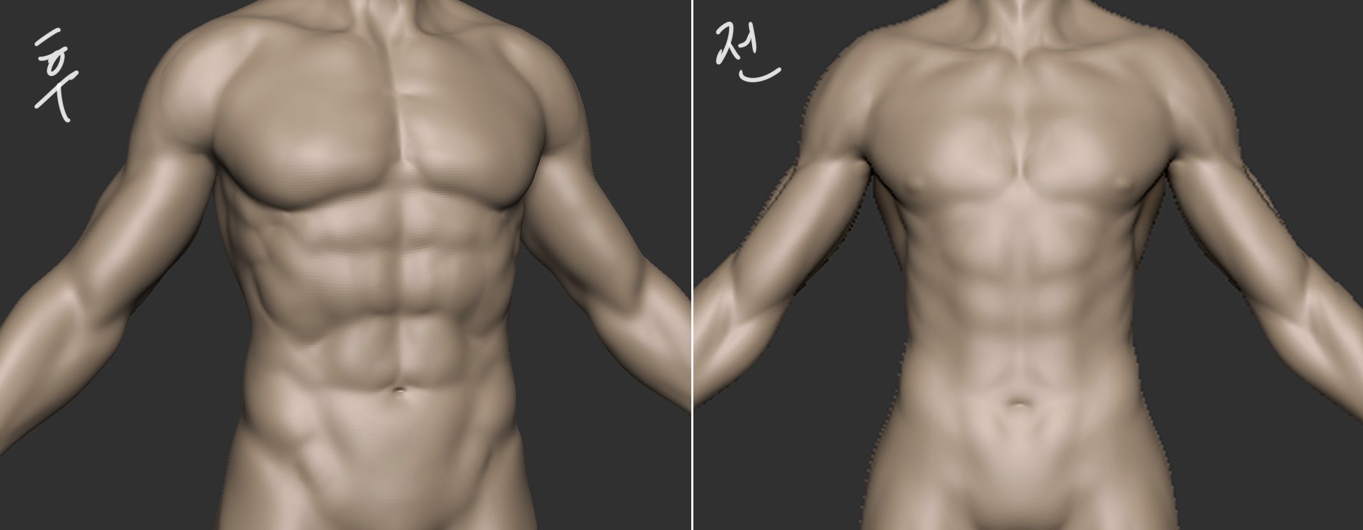 남성 캐릭터 기본 바디를 만들었던 것이 있었습니다. 그런데 지금보니....참...뭔가...그러네요. del higher로 디테일을 날려버리고 다시 묘사하는 편이 낫겠습니다.