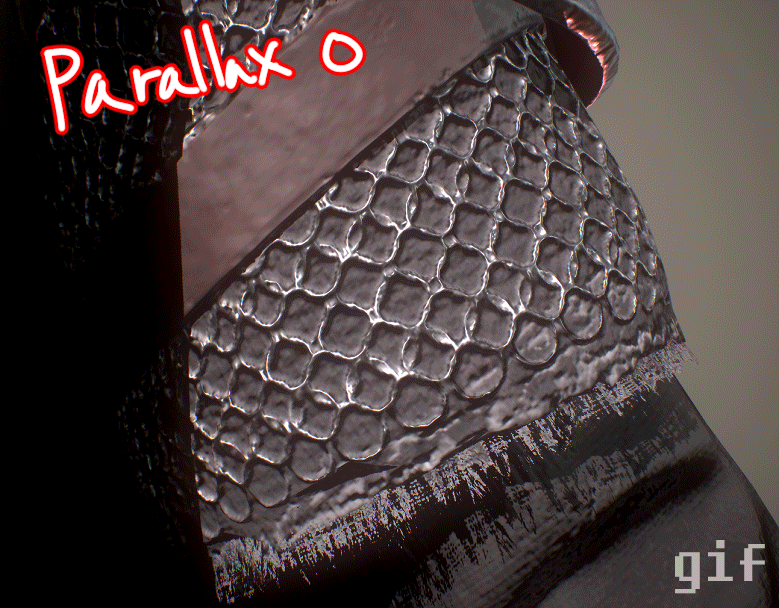 추가로 체인과 같이 너무 복잡한 구조라 메쉬로 표현하지 않고 평면으로 밀어버린 부분이 입체감이 조금 떨어지는 느낌이 있어 간단한 height 맵을 만들어 parallax를 이용해 약간의 눈속임을 주었습니다.