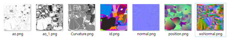 4096 사이즈 한 세트고, ao도 4096으로 뽑고 싶었는데 컴퓨터가 죽으려고 하길래 아쉬운대로 2048으로 뽑았습니다. 이 상태에서 클립스튜디오를 이용해 cage 간섭 등으로 인한 부분들을 수정하고 본격적인 텍스쳐링에 들어가면 됩니다.