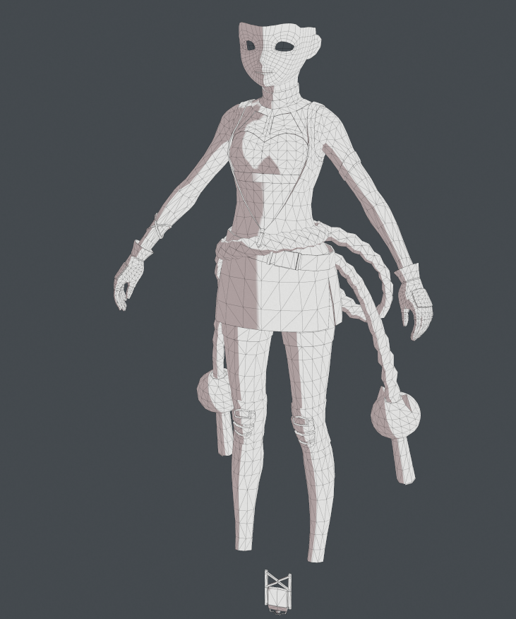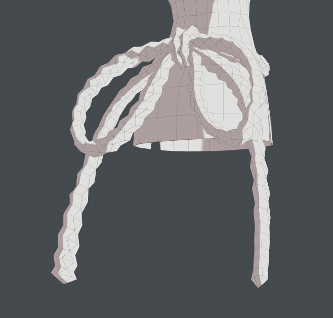 형태에서 고민을 좀 했던 허리끈 부분입니다. 처음에는 통짜 실린더에 텍스처로만 묘사를 하려고 했는데, 로오히의 모델링을 보니 굴곡 표현이 되어있었습니다. 이 부분에 폴리곤을 생각보다 많이 투자하긴 했는데, 이번 모델링은 저번보다 더 많은 폴리곤이 사용될 것을 이미 생각하고 있기도 했고 애초에 형태가 이런 형태라 어쩔 수 없는 부분이라 생각하고 넘어가기로 했습니다.
